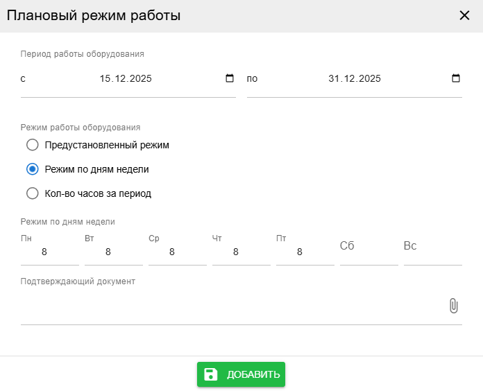 Добавление режимов работы для комплекса не отличается от одиночного оборудования. Режим влияет только на возможность заполнения отчетов о работе в рамках комлекса и не влияет на доступность в отчетах одиночного оборудования из состава комплекса. Режим комплекса не влияет на режимы работы составляющих его частей.