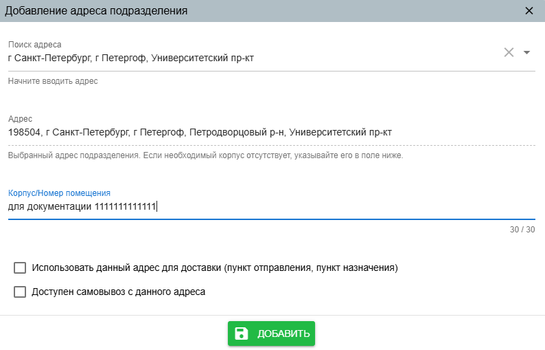 - Использовать данный адрес для доставки (пункт отправления, пункт назначения) (необязательное поле)