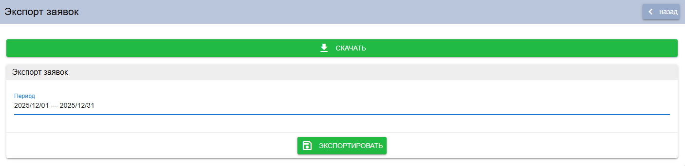 В списке всех заявок сотрудник патентного отдела может выгрузить реестр заявок, воспользовавшись кнопкой Экспорт заявок.